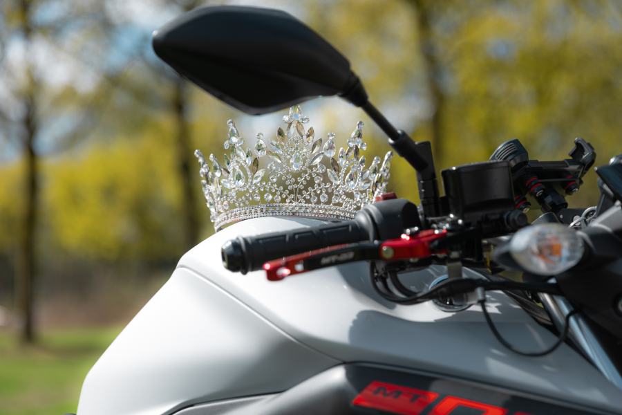 Maar deze shoot ging verder dan alleen elegantie. Door de combinatie met de motor voegden we een rauwer, krachtiger element toe aan het verhaal. Het contrast tussen glamour en power maakt deze serie uniek en geeft een compleet beeld van wie Ilse is: veelzijdig, sterk en stijlvol.