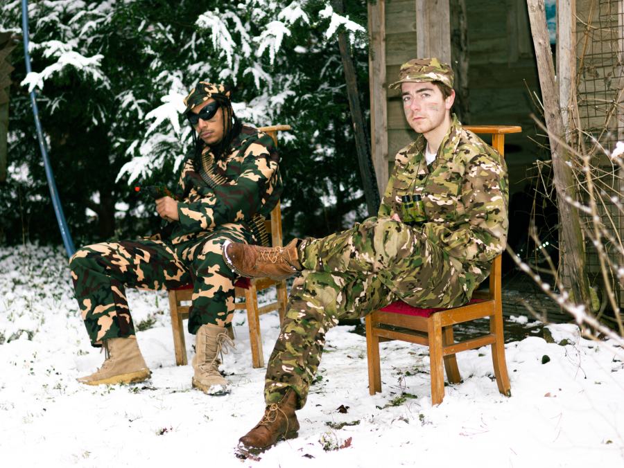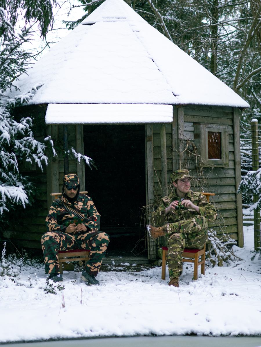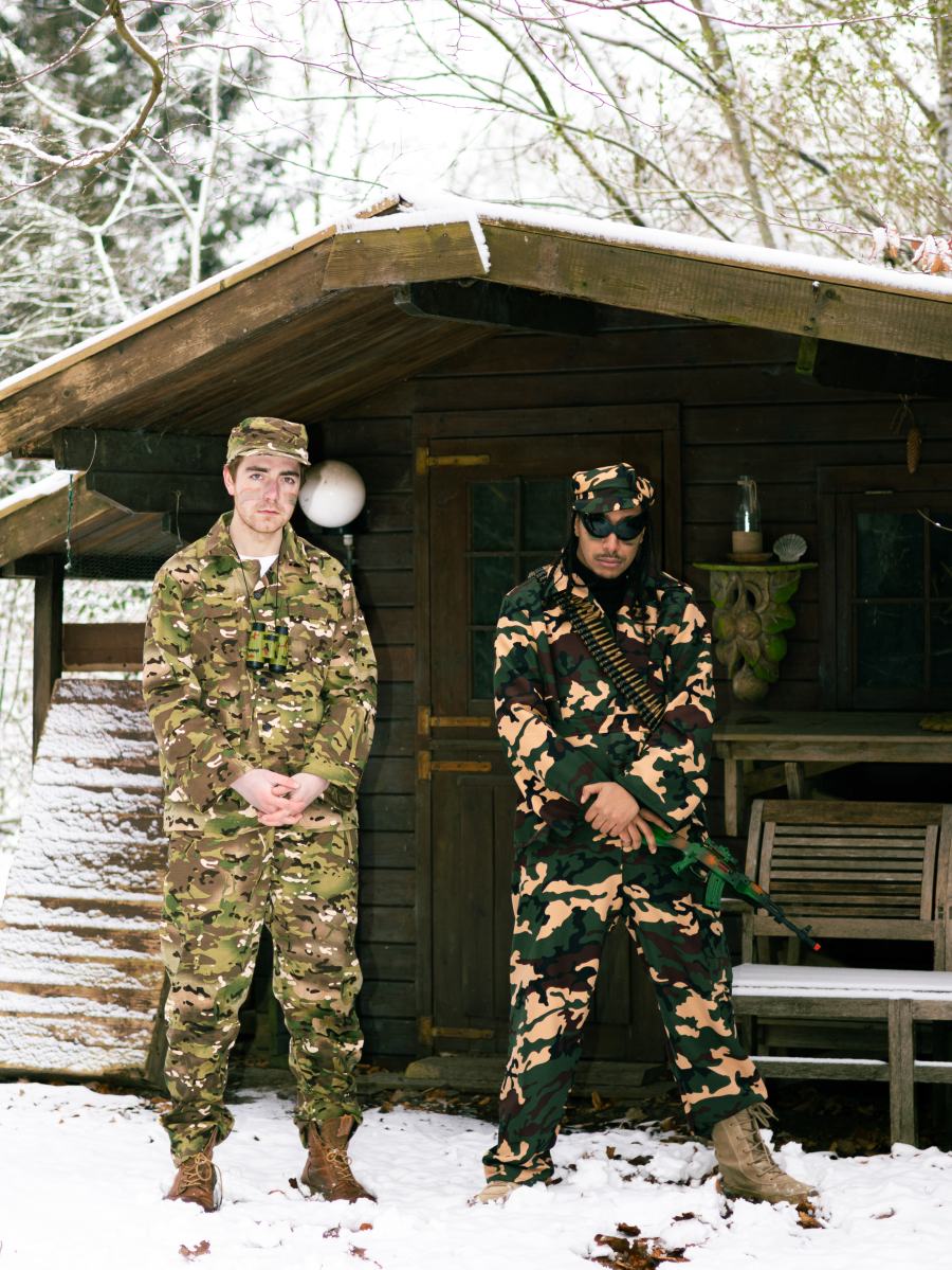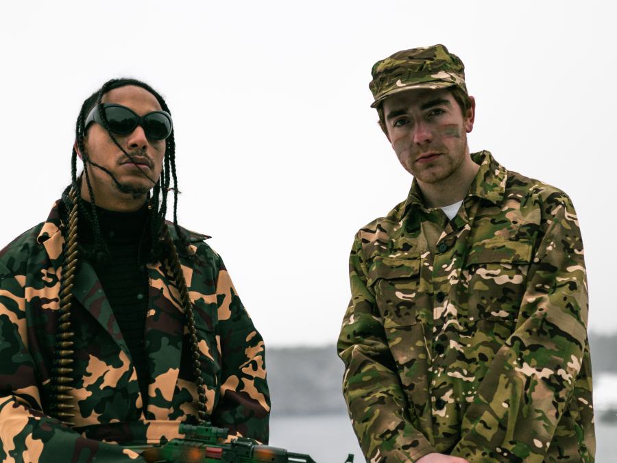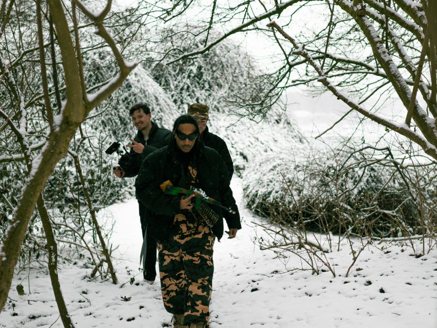 Tijdens de shoot begon het intens te sneeuwen, wat perfect aansloot bij de sfeer van de track. Waar militaire kleding normaal gesproken bedoeld is om te camoufleren, sprong het in deze witte omgeving juist extra in het oog. Het contrast tussen de outfits en het besneeuwde landschap gaf de beelden een krachtige en rauwe uitstraling.